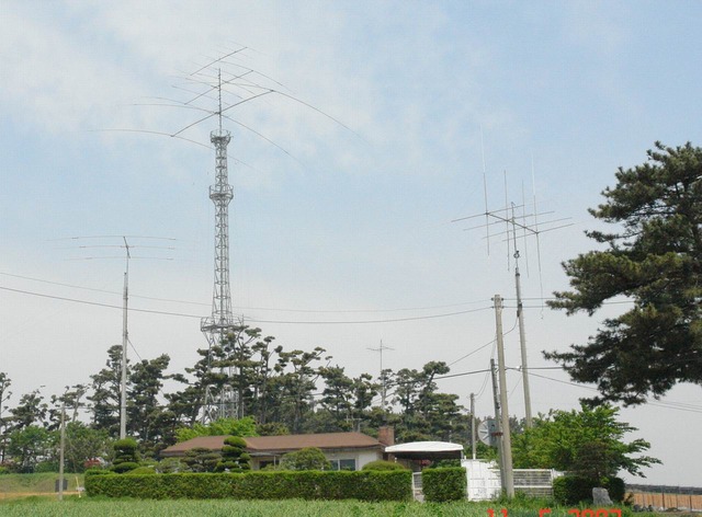 철탑은 35m짜리 이고, 제일 아래에 있는 ANT는 3.5Mhz 전용의 3 ELE YAGI로서 Element 길이 약 30m, Boom 길이 20m 짜리로서 자체 중량만 168Kg이고 1/2 파장이 조금 못되는 38m 높이에 있음. 그위에 있는 ANT는 7Mhz가 4 ELE, 14와 21Mhz가 6 ELE로 작동하는 TRI-Bands YAGI로서 41m 높이에 있음. 7Mhz에서 한파장의 높이에 있고 이 파장에서의 수직 Beam 페턴을 머리에